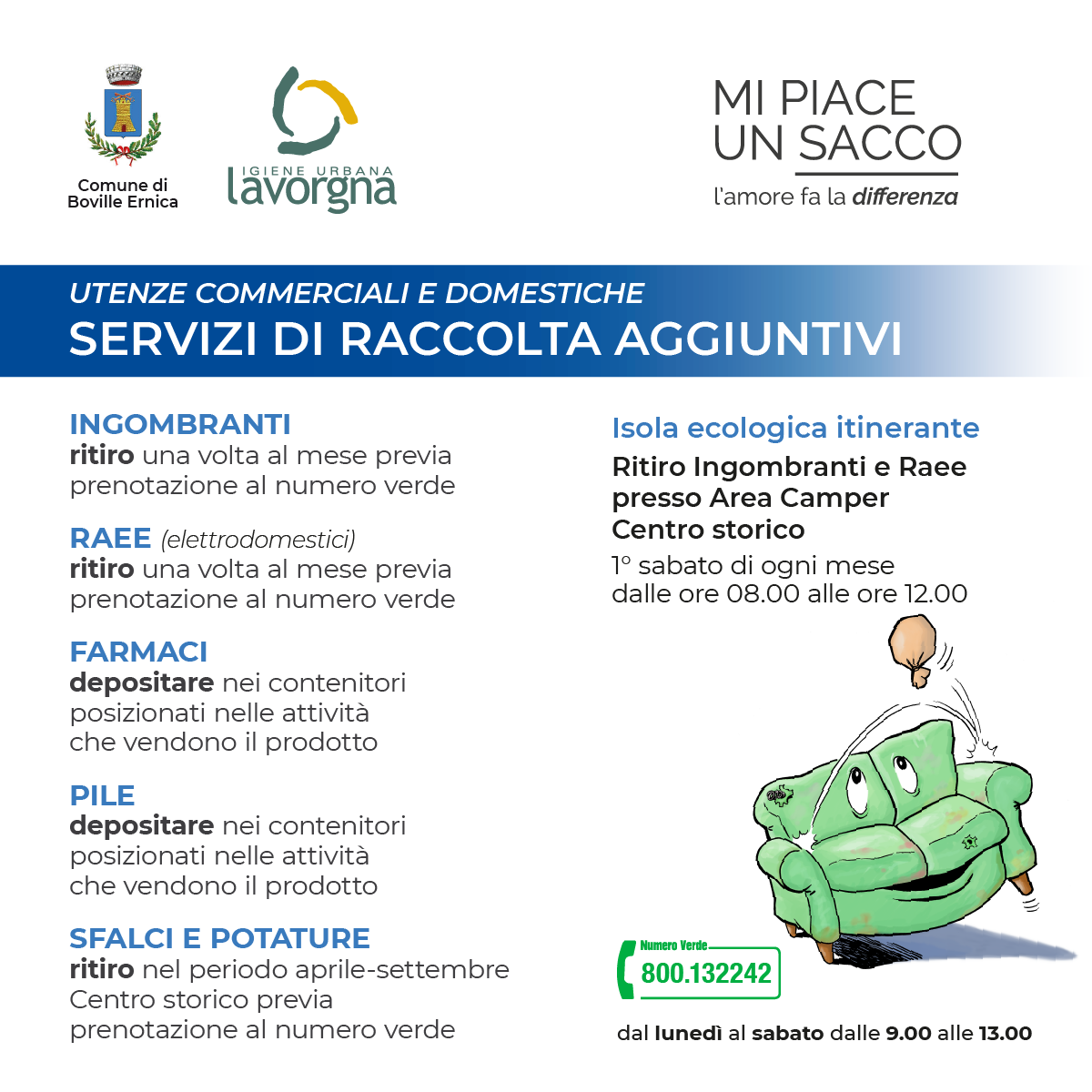 In aggiunta alla raccolta settimanale, sono previsti una serie di servizi per altre tipologie di rifiuti: ogni primo sabato del mese, dalle 8:00 alle 12:00, sarà possibile portare i rifiuti ingombranti e RAEE (Rifiuti di Apparecchiature Elettriche ed Elettroniche) all’Isola ecologica itinerante presso l’area camper del centro storico. Inoltre, per i mesi da aprile a settembre, è possibile prenotare il ritiro di sfalci e potature tramite il numero verde.